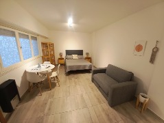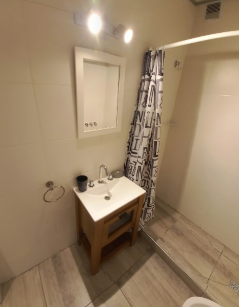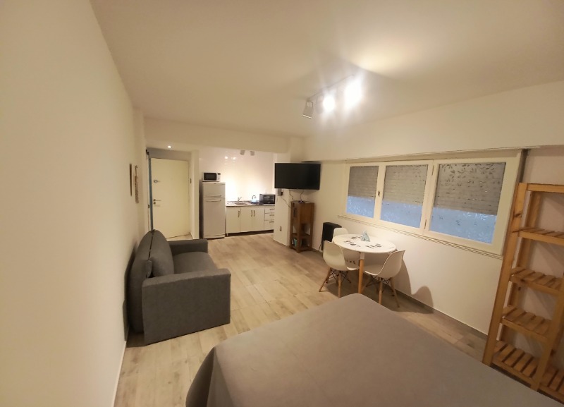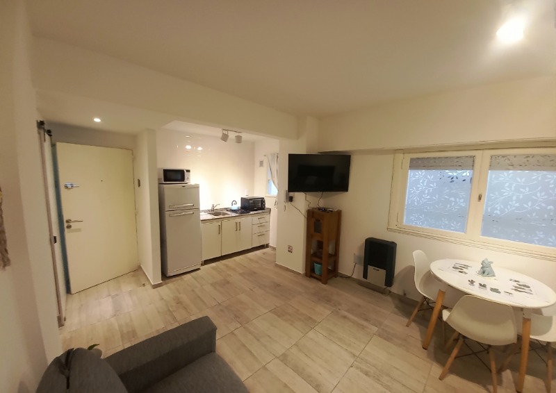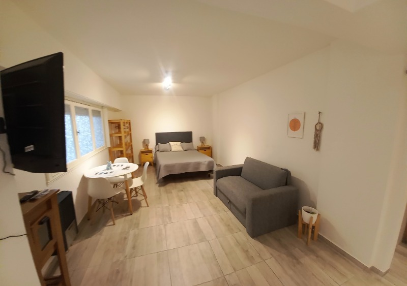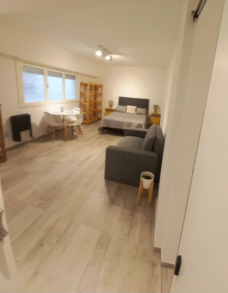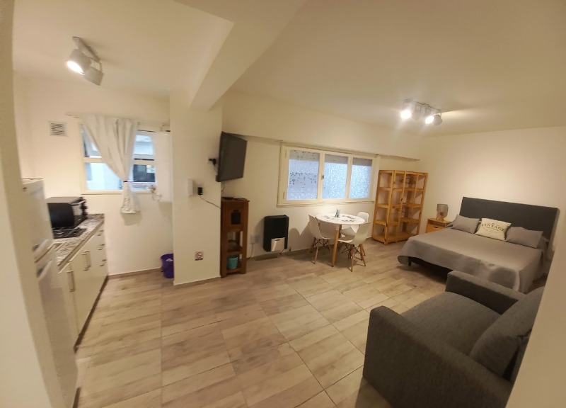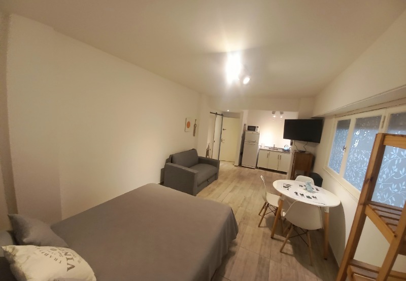 Departamento mono-ambiente, con cocina integrada. Totalmente reciclado a nuevo (cañerías de agua fría-caliente, desagües, conexiones de gas y de electricidad, etc.) muebles y artefactos, en su mayoría a estrenar y/o con poco uso.
